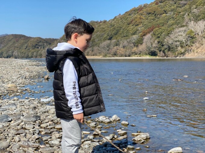 なんなら川に入って遊ぼうとしてたくらいこの時はダウンベスト着てるけど暑いって脱ぎ捨てて