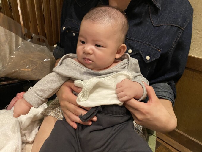 まだ生後2ヶ月なのに外食に慣れているし、ぜーんぜん泣かないし、なんだったら抱っこして寝ちゃったらそのままみんなの喋り声めっちゃ聞こえるなかスヤスヤずっと眠ってるの。