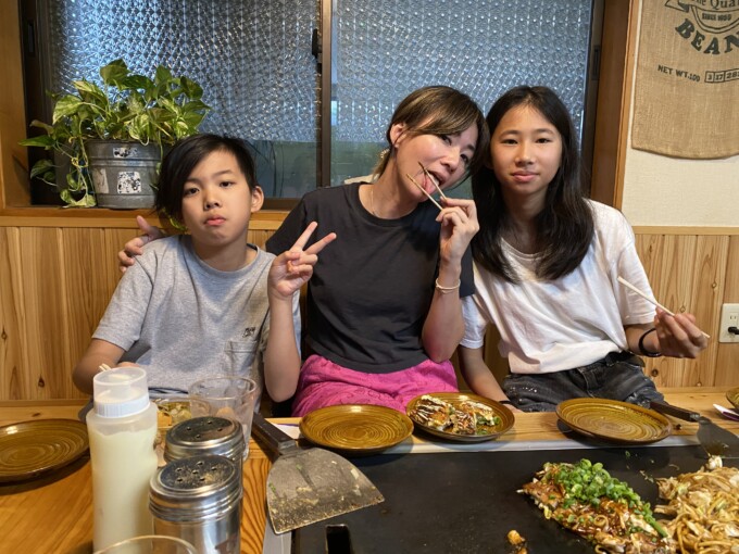 とにかくみーんな超食べるからどんどん焼いてもらってどんどん食べて、エメちゃんゆきちゃんはビール飲んで、わたしとゆなみもノンアル飲んで、キッズはコーラ飲んでポテトや揚げチーズも食べて満腹満タン!