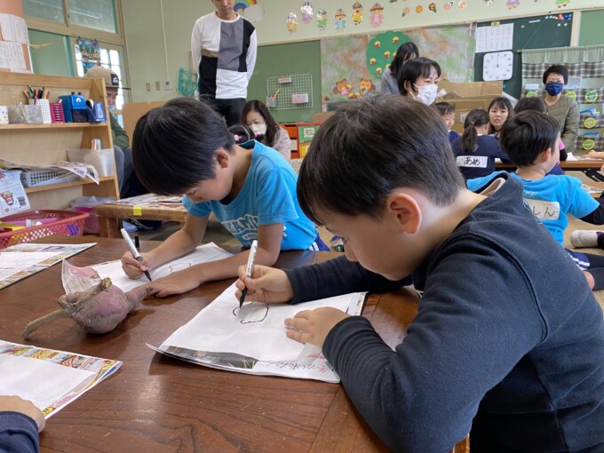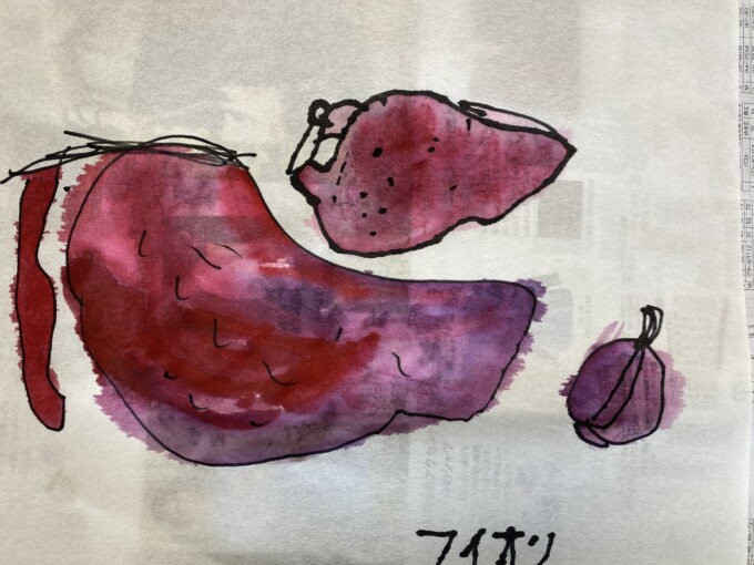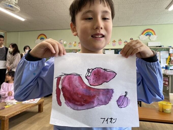 絵の具の種類は10色くらいしかなくて、紫って色はないから考えて色を組み合わせて作らないといけなかったの。でもこういう授業をしているみたいでみんな紫は赤と青を混ぜるってわかっていたし、お芋の赤紫にするには少し赤が多めだ!っていうのも知っていて上手に色を作っていたよ。