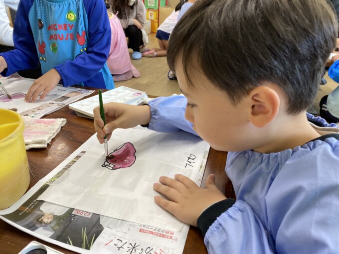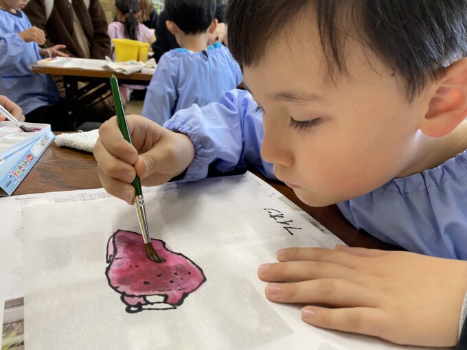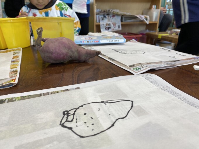 お芋堀で掘ってきたサツマイモを和紙に描いて絵の具で塗るっていう挑戦。