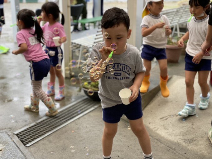 その後は実際にお外にでてシャボン玉をして遊ぶっていう流れだったよ。
