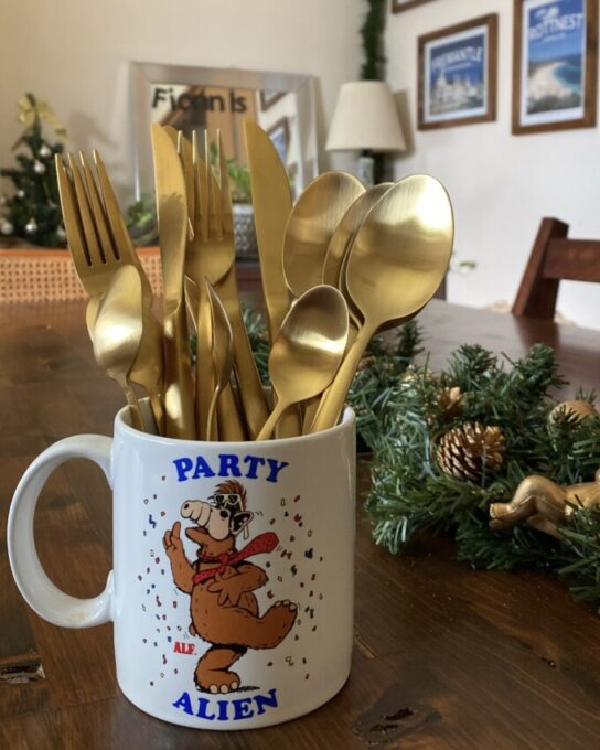 今回使ったこのゴールドのカトラリーはもう5年くらい前にオーストラリアの多分TARGETとかで買ったやつなの。普段はぼぼ使わないから出番はだいたいこの季節。これを食器とかと一緒に収納しているんだけど、これはアルフのマグに入れているのね。いつもは見えないところにあるんだけど、そこにもかわいいが沢山あってわたしの自己満空間。