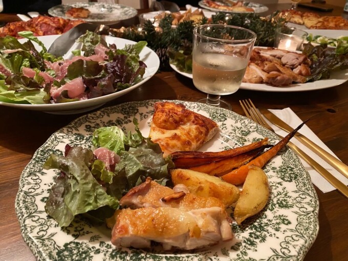 作ったのはお家にあるものでサラダと、お家にあったじゃがいもとにんじんのロースト、あと先週のディナーパーティーで作ろうとして作らなかったキウイとディルのモッツァレラのやつと唯一買ったチキンでガーリックロースト。あっという間にできるやつばっかりだけど、雰囲気でパーティーディナーになってるよね!