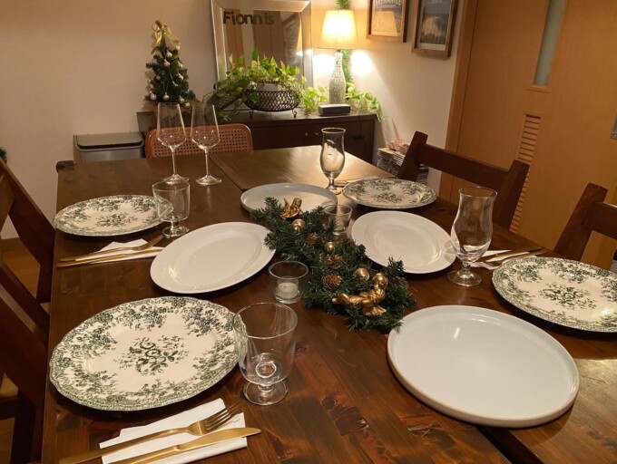 それぞれのディナープレートをZARA HOMEのアンティークっぽい緑のにしてカトラリーをゴールドにしたからこれだけですんごいクリスマス感でたのよね!