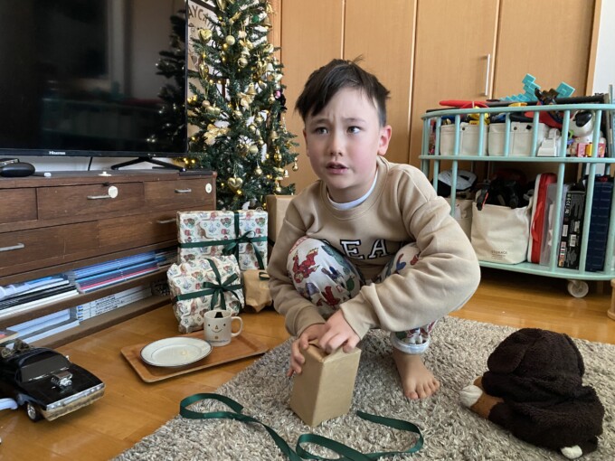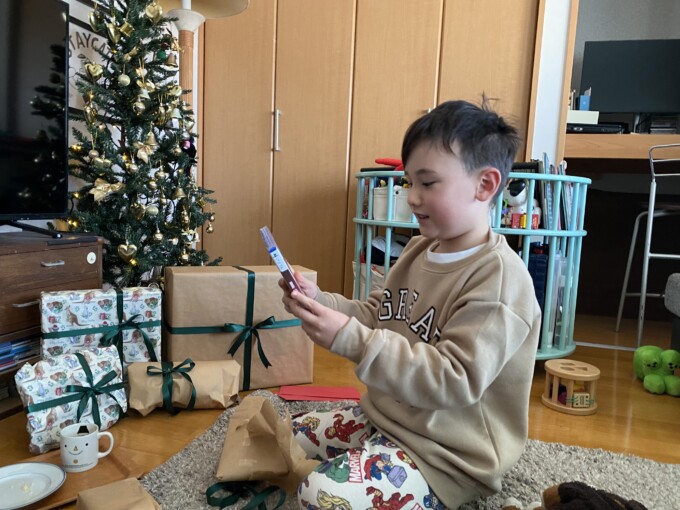 起きたらすぐに「マミー!サンタ来てるかも!!!」(朝7時くらいね、普段ぜんぜん起きる時間じゃない)って、リビング行ってプレゼント見て大興奮!ほんと漫画みたいに飛び跳ねてよろこんでいたよ。