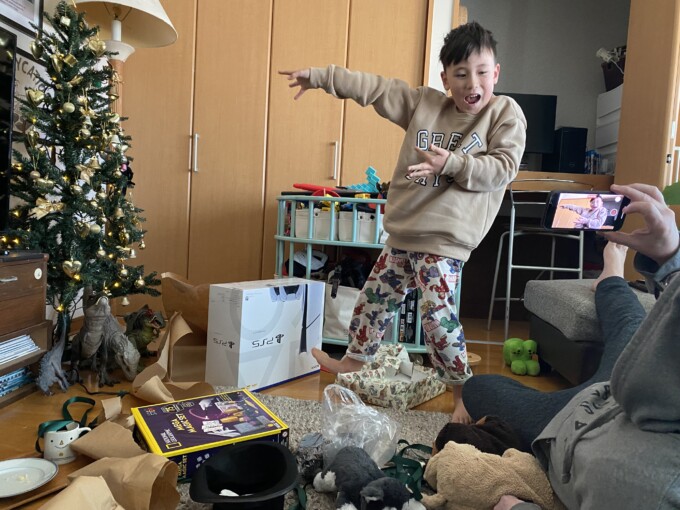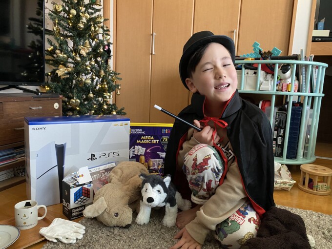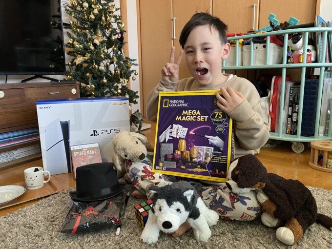 わたしの写真の時にはもう飽きてあくびしてたけど、プレゼントは本人がお願いしていたスパイダーマンのゲームソフトと、幼稚園で願い事として紙に描いたらしいワンちゃんと、欲しそうにしていたからルービックキューブと、大盤振る舞いのPS5とオーストラリアからはマジシャンセット。