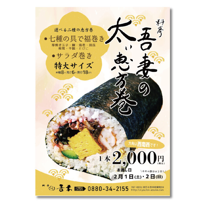 料亭の板さんがつくる具沢山のほんとに太い重いおいしい恵方巻だからとってもおすすめなんだよ!