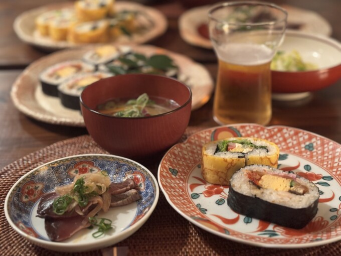 わたしとエメちゃんは恵方巻と本当はおすましが飲みたかったけどエメちゃんちょっぴり苦手なので豚汁にして、スーパーで買ったうすっぺらいタタキとで節分ディナー。