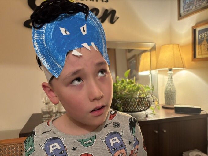 学校で図工の時間に作ったお面を持って帰ってくれていたから記念にお写真。