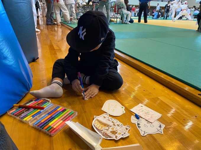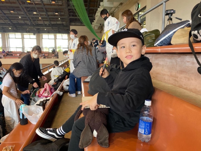 試合以外の時間はペンとスケッチブックでずっといい子にいてくれたよ。
