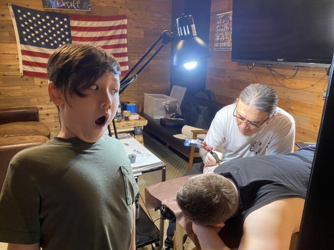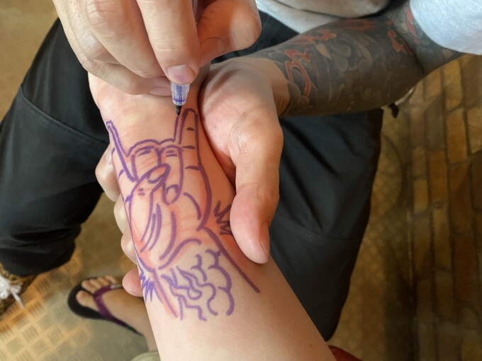 それもちゃんと手はこっち向きで、この辺にこういう方向でってちゃんと明確に自分の欲しい構図が決まっていてきちんと伝えて描いてもらっていたよ。これで振り返って数えてみたら5回目だ!2歳からいろんなタトゥーを描いてもらってるなんて贅沢だなぁ。