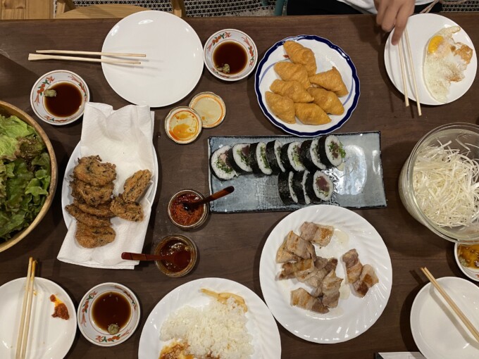 おとなチームは土佐巻やおいなりさんに、みかちゃん特製のがんもと何かの揚げ(これおいしかったの!)と亀ちゃん特製サムギョプサルだけどハリッサつけてレタスと白髪ねぎでたべるやつ(これもおいしかったから絶対真似する!)これをつまんでいる間に今日のメイン来ました!