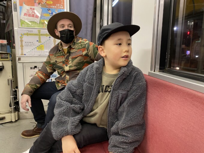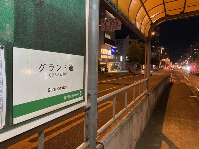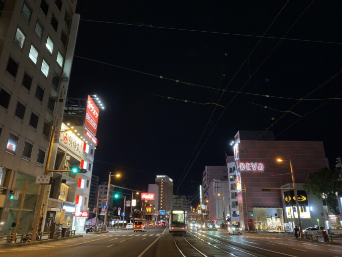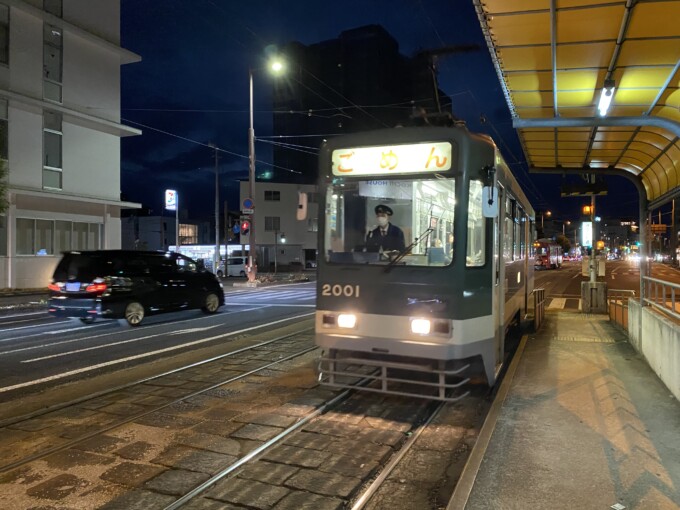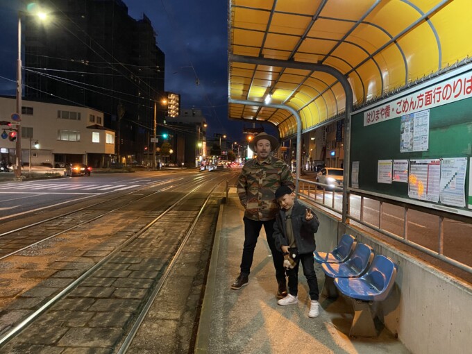 そんなに混んでいると思わずホテルとっていなかったら1週間前でもういつものホテルは全滅で、ちょっとだけ遠いところ(って言っても帯屋町まで500mくらいだけど)ディナーに行くために路面電車利用。歩いていける距離だけど、フィオン喜ぶしね!