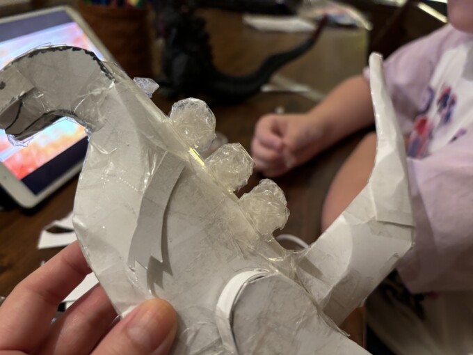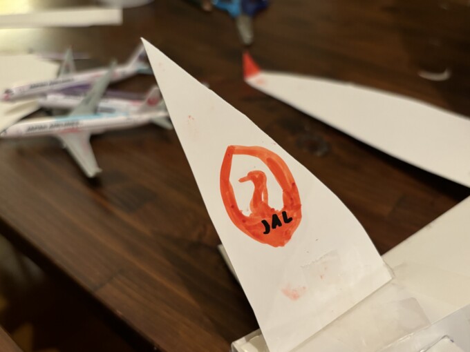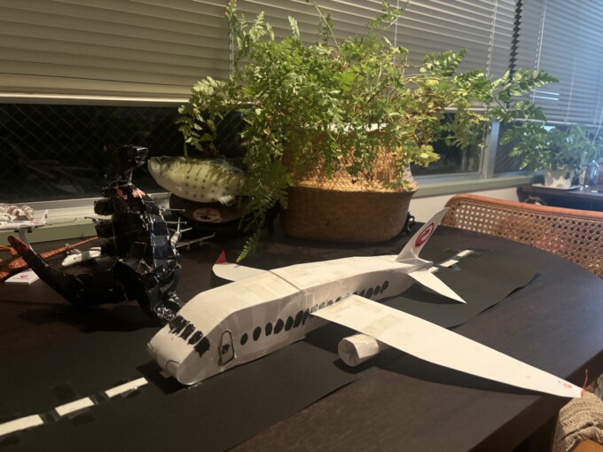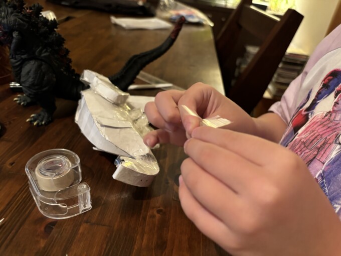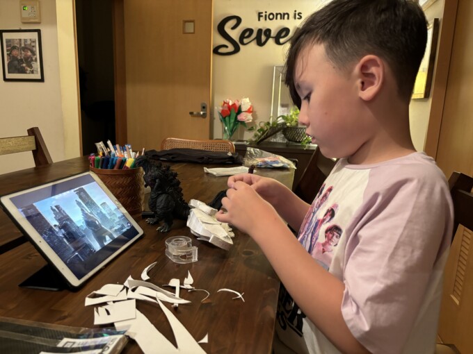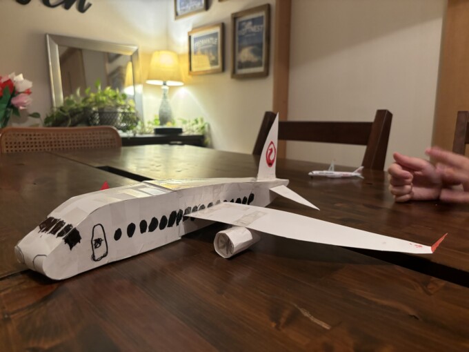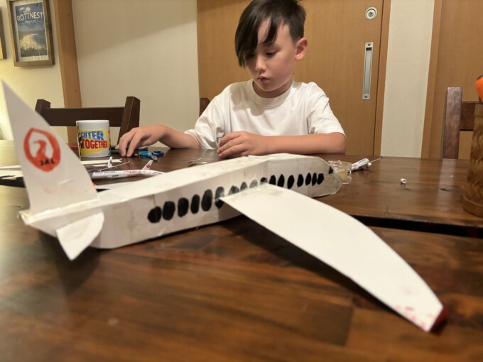 夏休みの間に思いついてはたくさんの工作を作っていたフィオン。今回アップしている飛行機もゴジラも白い厚紙をサラサラ~と躊躇なく切っていってそれをテープでくっつけて立体していくの。ほんと感心するレベルで形にしていくんだよ。本人曰くどうやったら立体になるか(展開図)が頭の中にあるらしい。