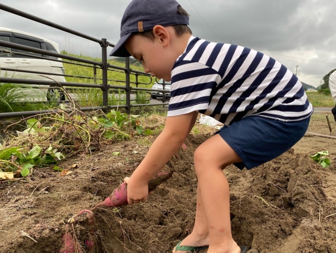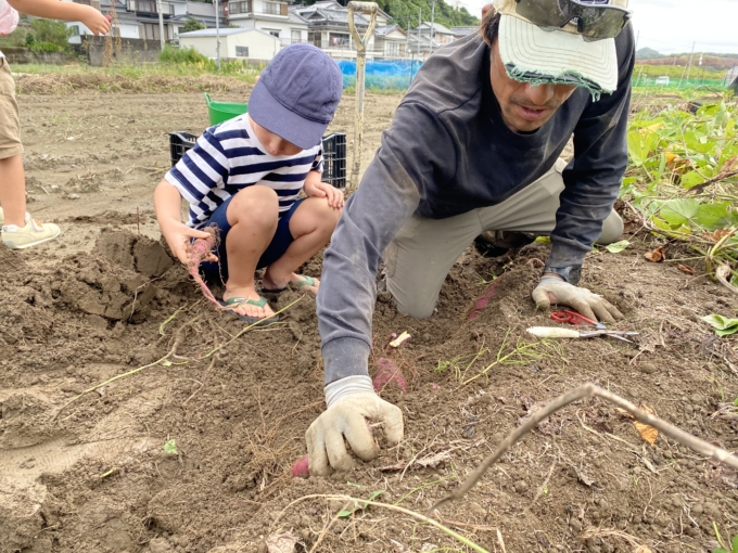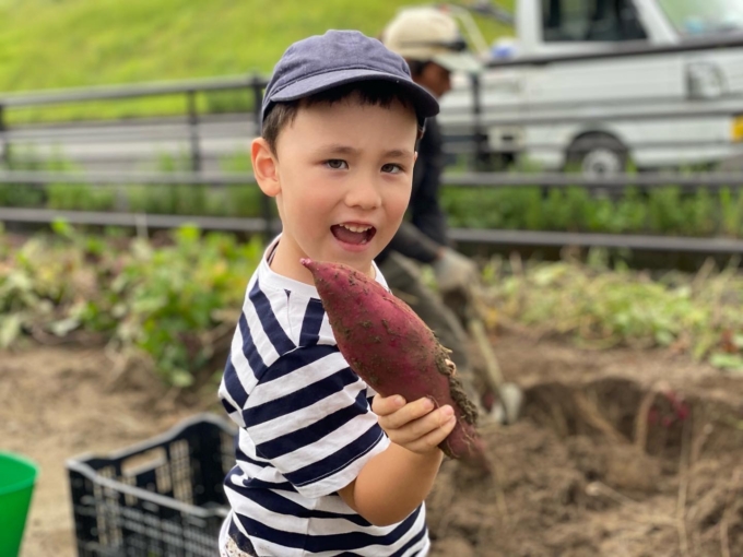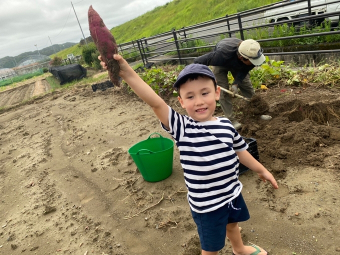 しんじが掘りやすいようにクワである程度お芋みえるようにしてくれたから