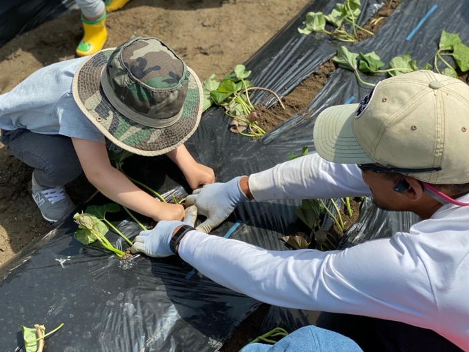 お芋はこういう葉っぱと茎を横向きに植えるのが、植え付けだってことぜんぜん知らなかったのよね。
