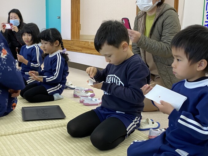 うちの幼稚園は年中さんから裏千家の先生方がいらっしゃって指導をしてくださる体験の時間があって、はじめてのフィオン達に担任の先生がどうも「緑でちょっぴり苦いお茶」と説明したみたい、それを酸っぱいと解釈してサワーって言ったんだね。かわいい。