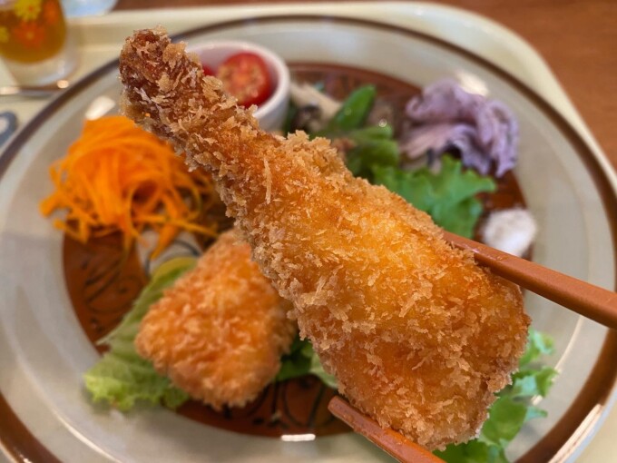 これ何かわかるかしら?わたし初めて食べたんだけど、えびじゃがコロッケ!!エビをポテトで包んでいるコロッケ!これがまたおいしかったのよ。