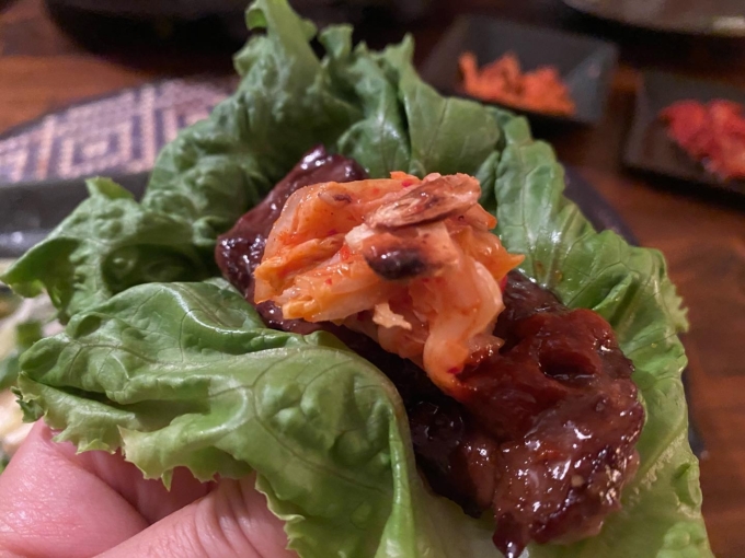 普段から好きな組み合わせ、ハラミにタレつけてコチジャンのっけてキムチににんにく。