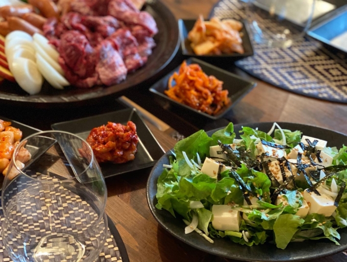 お供はキムチの盛り合わせと、適当作った韓国風っぽいサラダ。