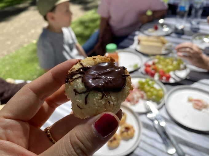お義母さんが午前中にピクニックに持っていけばいいね!っておいしいココナッツクッキーを作ってくれていたよ。お義母さんはいつもササっとお菓子を作るのよね。とにかくオーブン料理が得意でお家を建てるなら大きなオーブンが欲しくなったよ。