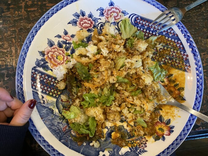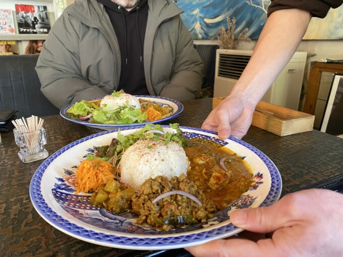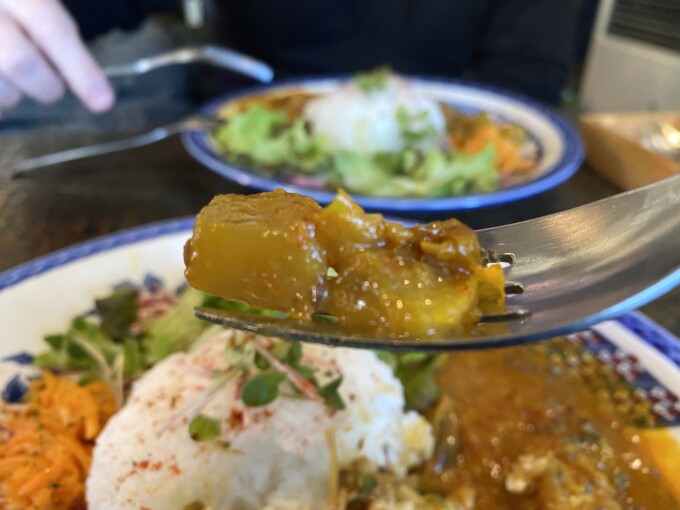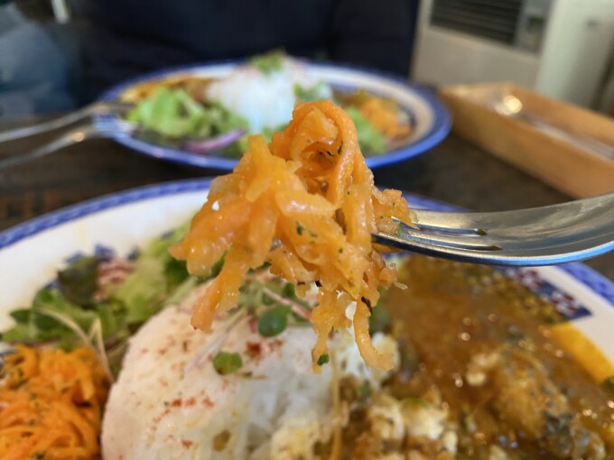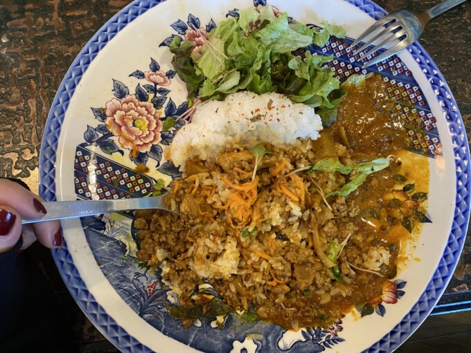 まずはカレーだけをごはんと混ぜてたべるんだけど、食べ進めていくうちに副菜なんかと混ぜて行っちゃうスタイルね。これ絶対おすすめ!味変がたくさん楽しめてとってもいい。